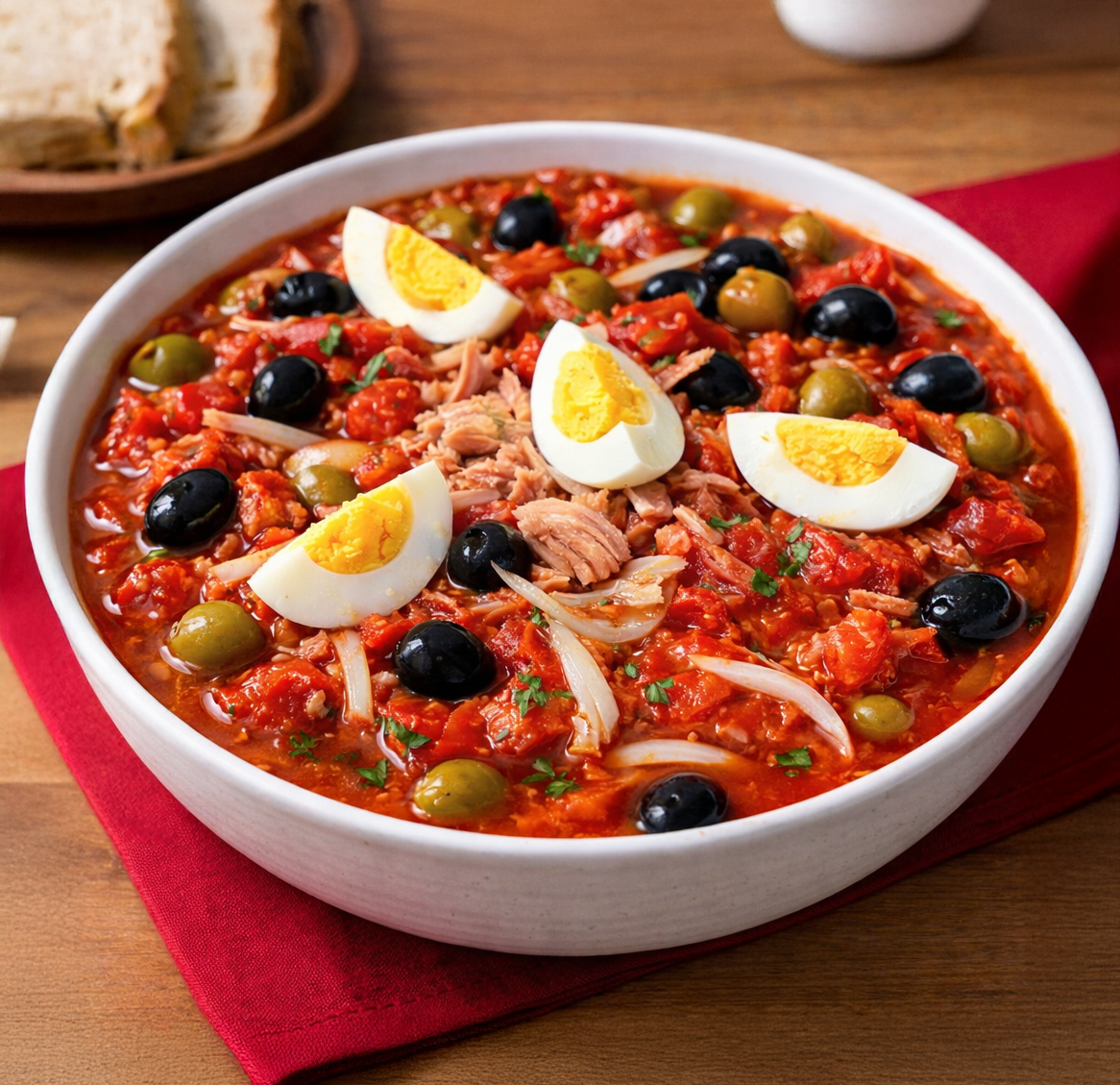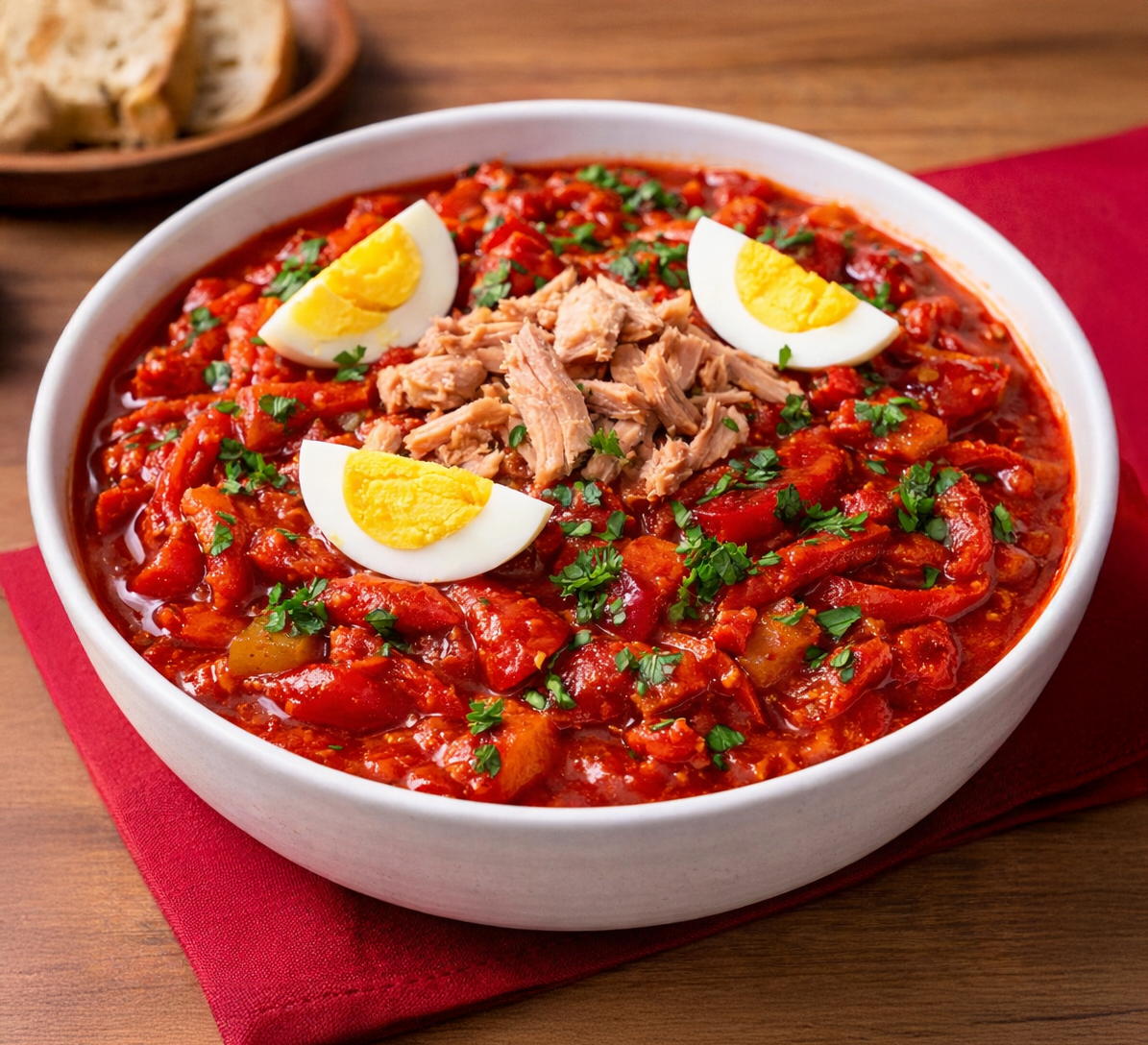 El Moje Manchego es una receta tradicional basada en tomate, pimiento, aceite de oliva y un toque justo de aliño, que se sirve como acompañamiento o plato frío.